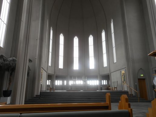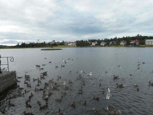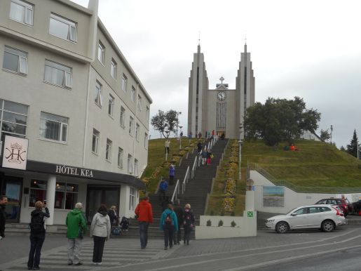 Chvíli jsme pozorovali značné množství ptáků na jezeře – jsou tu kachny, husy a několik druhů racků a ze břehu jim ještě sekundují holubi. Potom jsme kolem budovy národní galerie zamířili nahoru: chtěli jsme se totiž na kostel Hallgrímskirkja podívat pořádně. Je to v podstatě největší stavba v celém městě a stojí před ní socha Leifa Eiríkssona, vikingského objevitele Ameriky. I když je ale kostel zvenčí impozantní, uvnitř je luteránsky strohý.