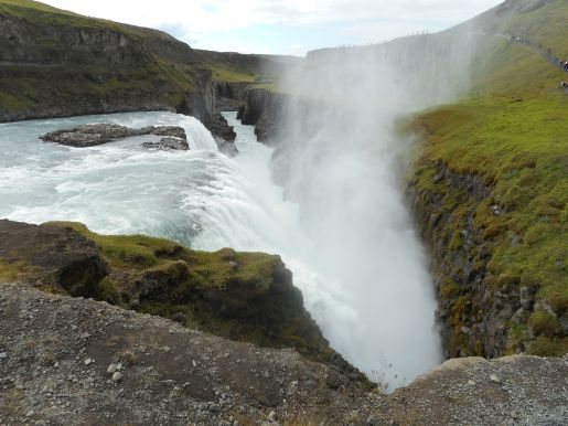 Gullfoss je velmi populární místo. Je to 32 metrů vysoký dvoustupňový vodopád, i když jeho celou výšku návštěvník nevidí, protože voda se tu řítí do hluboké průrvy. I tak je to ovšem nádherná podívaná. Navíc je za horami vidět druhý největší ledovec Islandu, Langjökull. Pohled na něco, co vypadá jako nekonečné bílé moře táhnoucí se nad úrovní hor, je impozantní.)