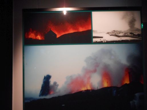 Zajímavá byla velká kruhová obrazovka, která ukazovala průběh erupce. Čas se na ní posouval tak, že návštěvníci točili těžkým zábradlím za doprovodu dunivých zvuků. Mohli jsme vidět, jak se otevřela puklina v zemi a jak se během následujících dnů a měsíců celý ostrov zvětšil díky proudům lávy na východě, zatímco na západě pod sebou láva pohřbila třetinu města.